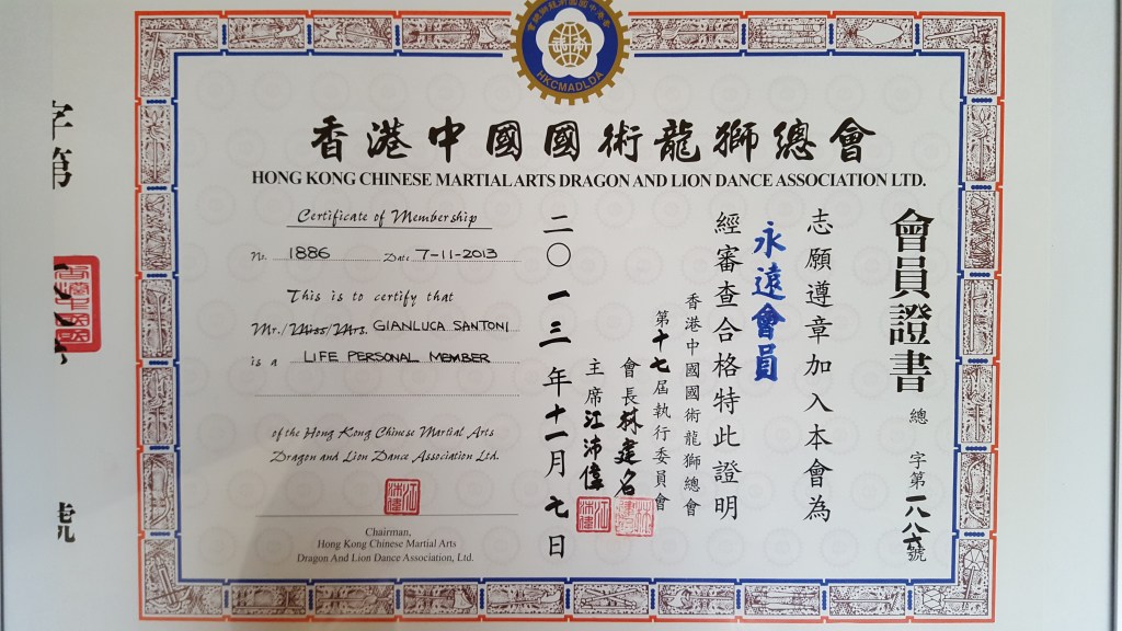 Per questo non ho esitato a fare una cosa che non avevo mai fatto prima per nessuno (nonostante le infinite richieste): l’ho messo in contatto con i miei fratelli della Hon Chung Gymnasium Student Union: Cheung Yee Keung, Kong Pui Wai, Raymond Lau, Seto Wing. Gianluca ha saputo costruire con loro una relazione di reciproca stima, sulla base della quale Kong Pui Wai (oggi chairman dell’Associazione arti marziali e lion dance di Hong Kong, tra i più stimati maestri di Hong Kong) lo ha accettato come allievo.